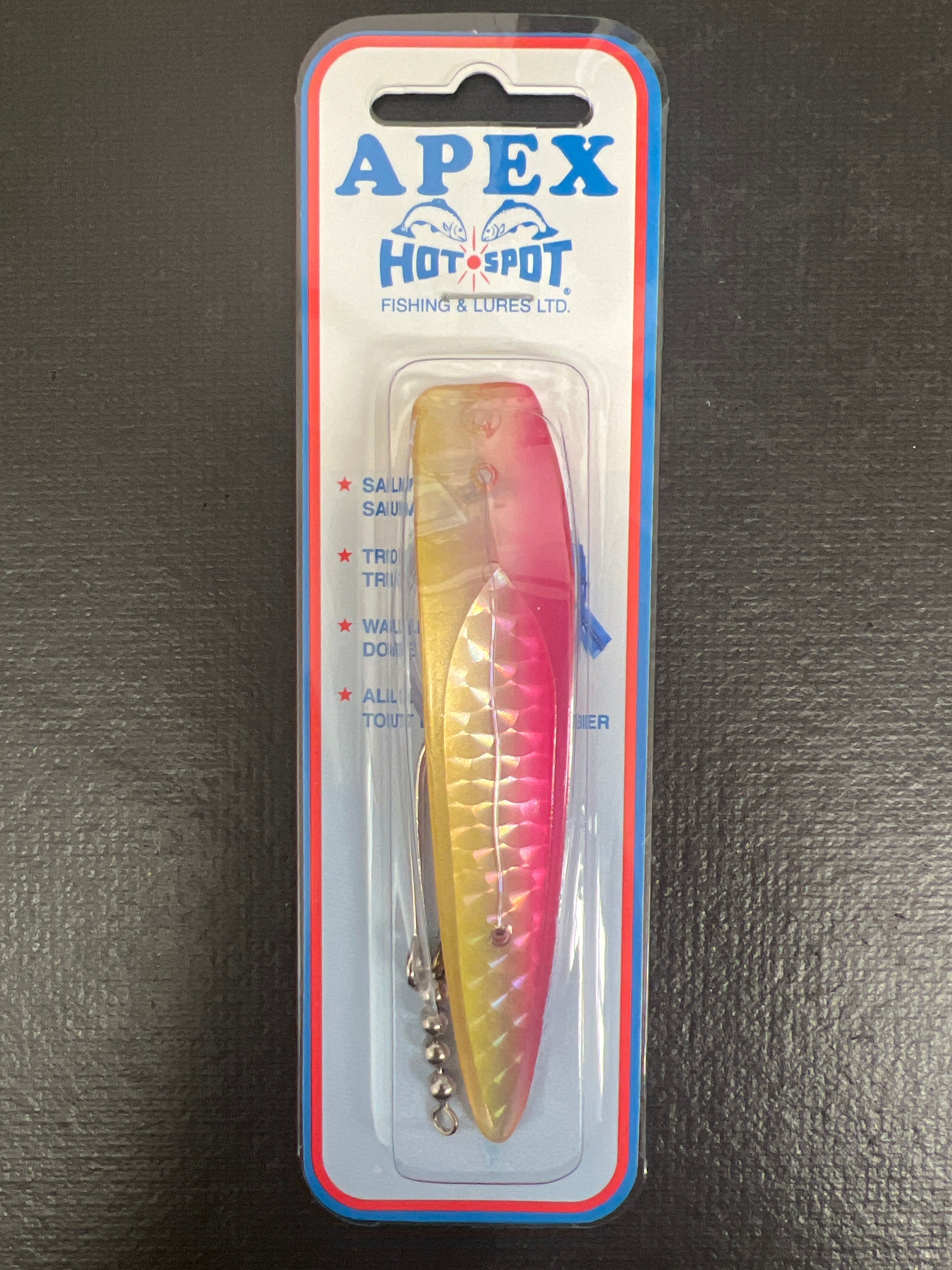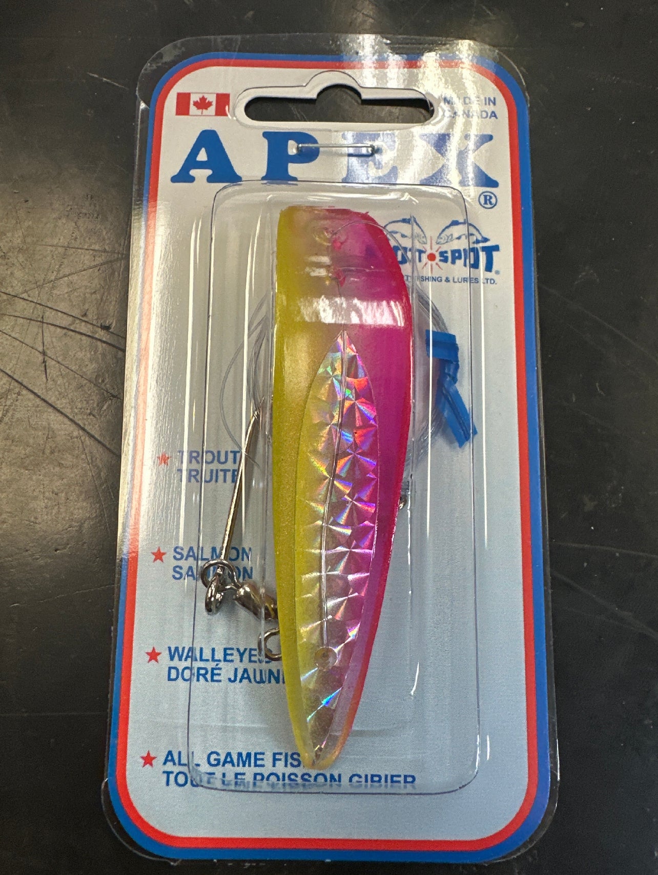 Designed for trolling, the dodging and waving action of an Apex creates strong vibrations in the water. Often, the interactive vibration made by a wounded bait fish are the most enticing. The Apex lure duplicates these movements. Its contoured scope front surface causes a rapid, side to side, shaking action as it is trolled. The Apex will also dart violently from side to side and will spin from time to time.