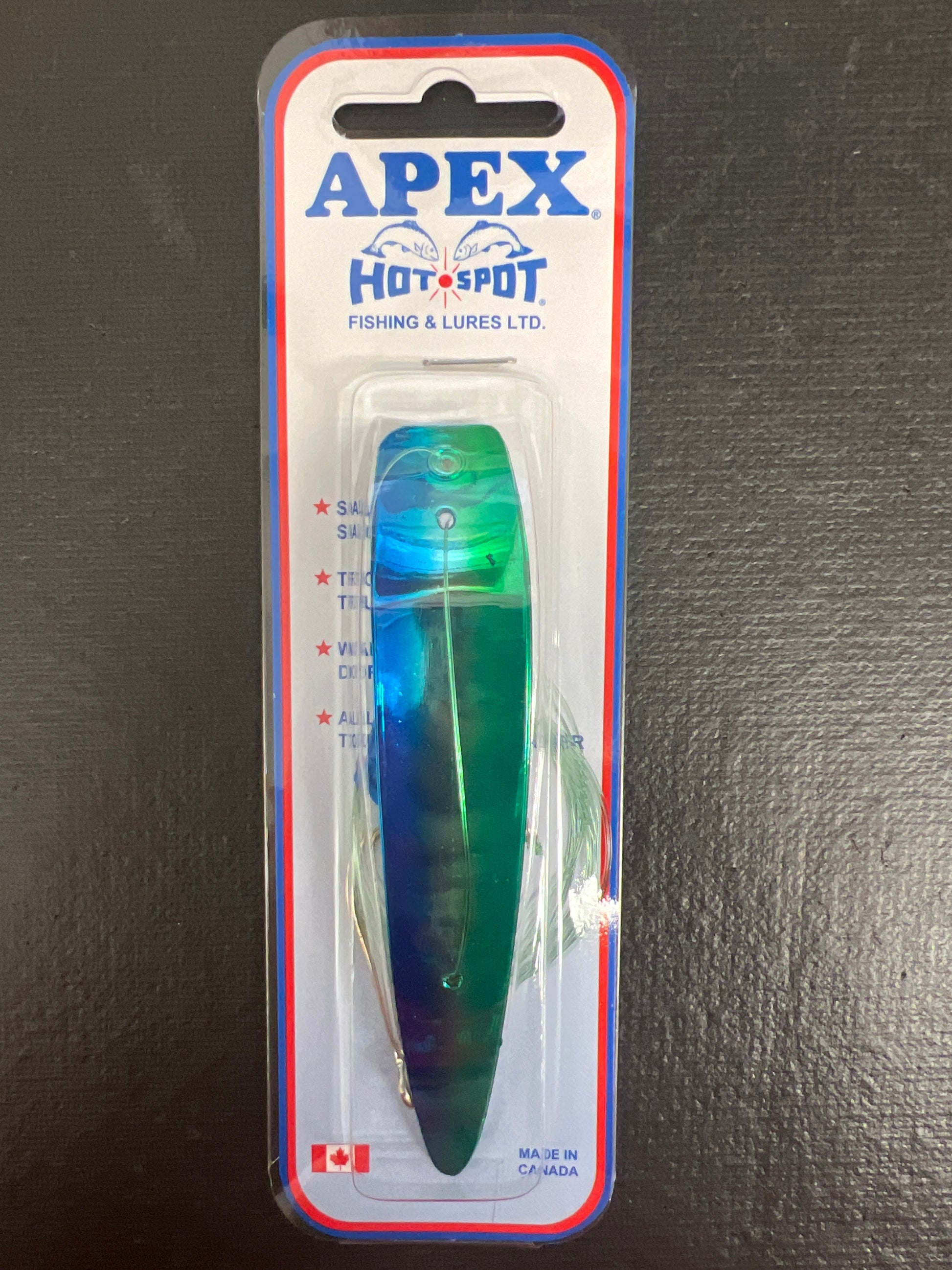 Designed for trolling, the dodging and waving action of an Apex creates strong vibrations in the water. Often, the interactive vibration made by a wounded bait fish are the most enticing. The Apex lure duplicates these movements. Its contoured scope front surface causes a rapid, side to side, shaking action as it is trolled. The Apex will also dart violently from side to side and will spin from time to time.