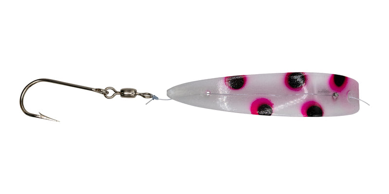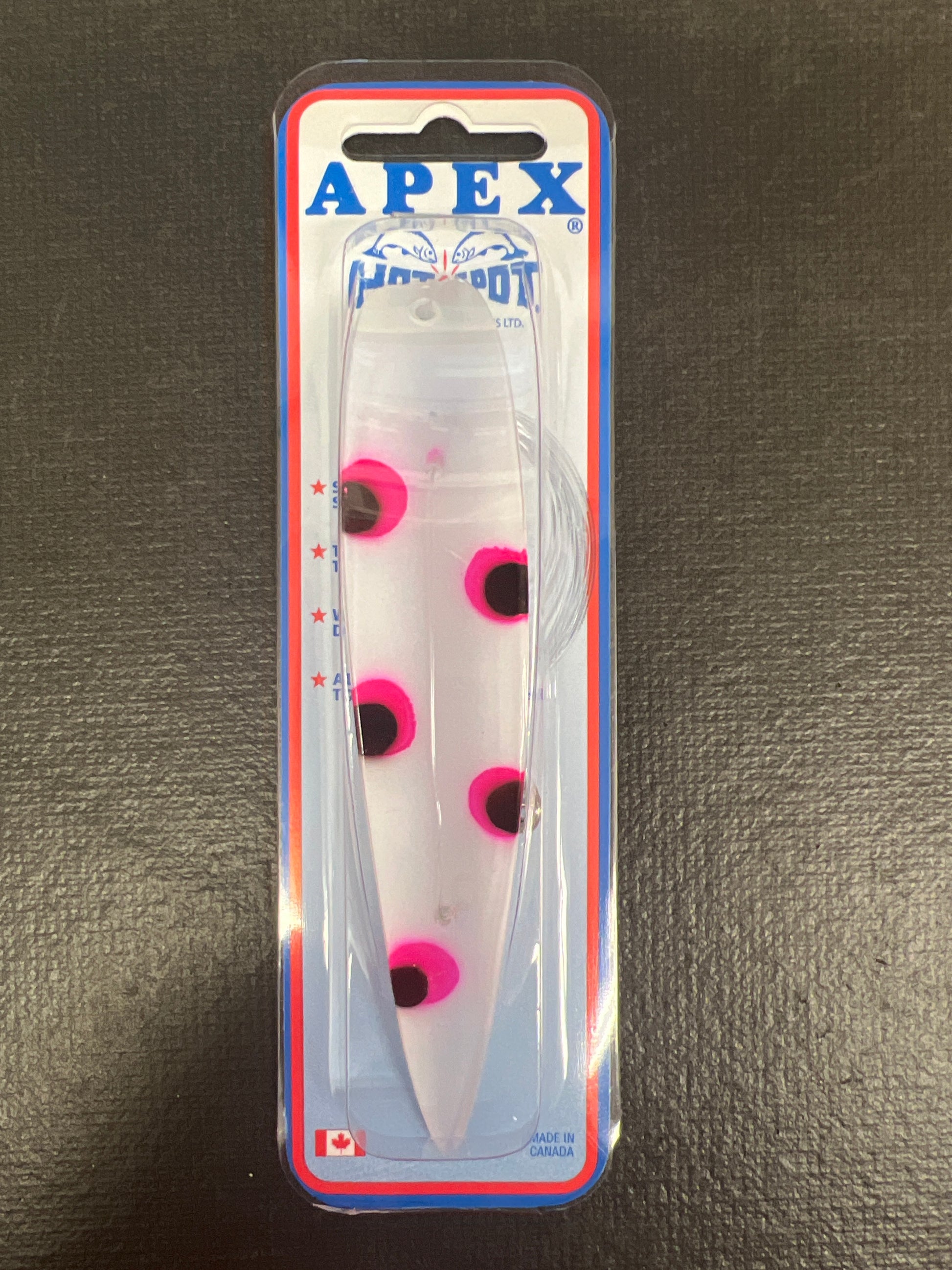 Designed for trolling, the dodging and waving action of an Apex creates strong vibrations in the water. Often, the interactive vibration made by a wounded bait fish are the most enticing. The Apex lure duplicates these movements. Its contoured scope front surface causes a rapid, side to side, shaking action as it is trolled. The Apex will also dart violently from side to side and will spin from time to time.