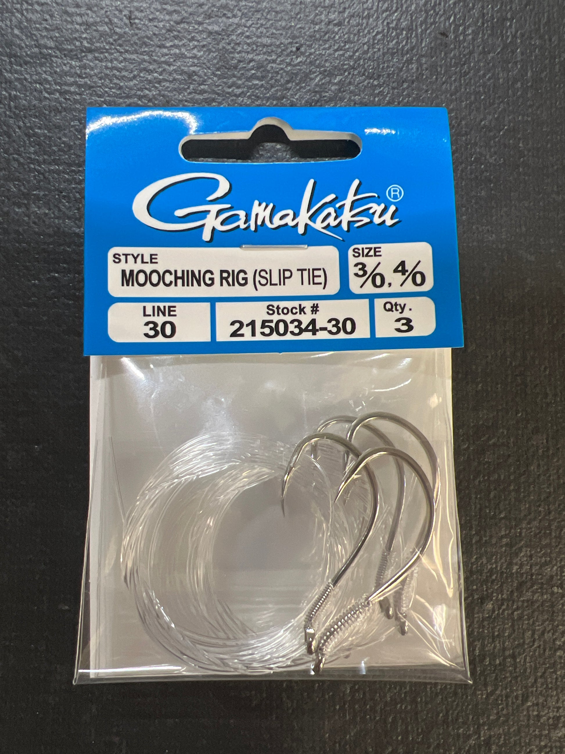 Gamakatsu's Slip Tie Mooching Rig is the first choice of serious salmon anglers around the world who prefer the slip tie rigging for herring or anchovies. Tied on 6' leaders using premium monofilament, line size is matched to the hooks with a full selection of options to choose from. 3 individually packed leaders, 6 foot rig.