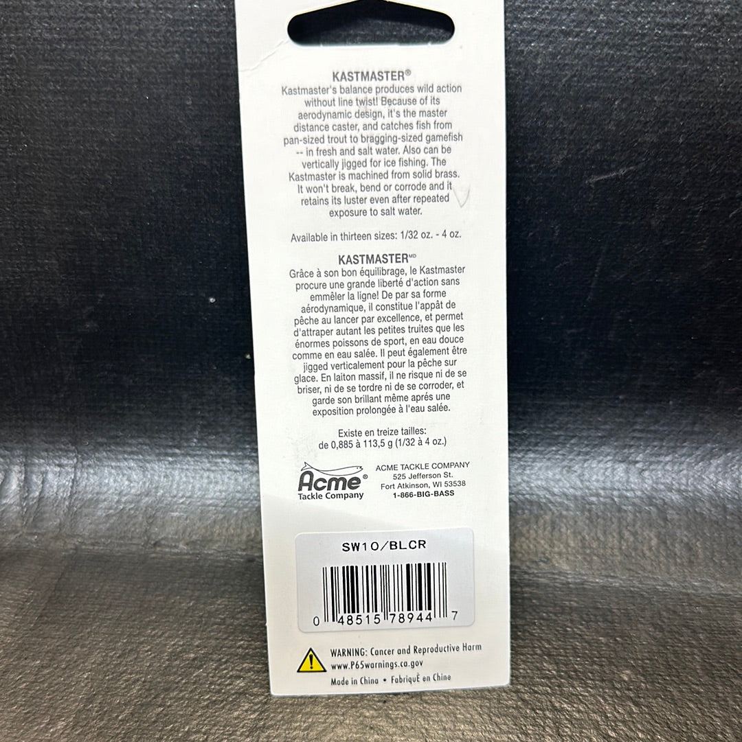 Kastmaster’s balance produces wild action without line twist! Because of its aerodynamic design, it’s the master distance caster, and catches fish from pan-sized trout to bragging-sized stripers – in fresh and salt water. The Kastmaster is precision machined. It will not break, bend or corrode and it retains its luster even after repeated exposure to salt water. Each lure comes with a split ring and a treble hook on the bottom of the lure