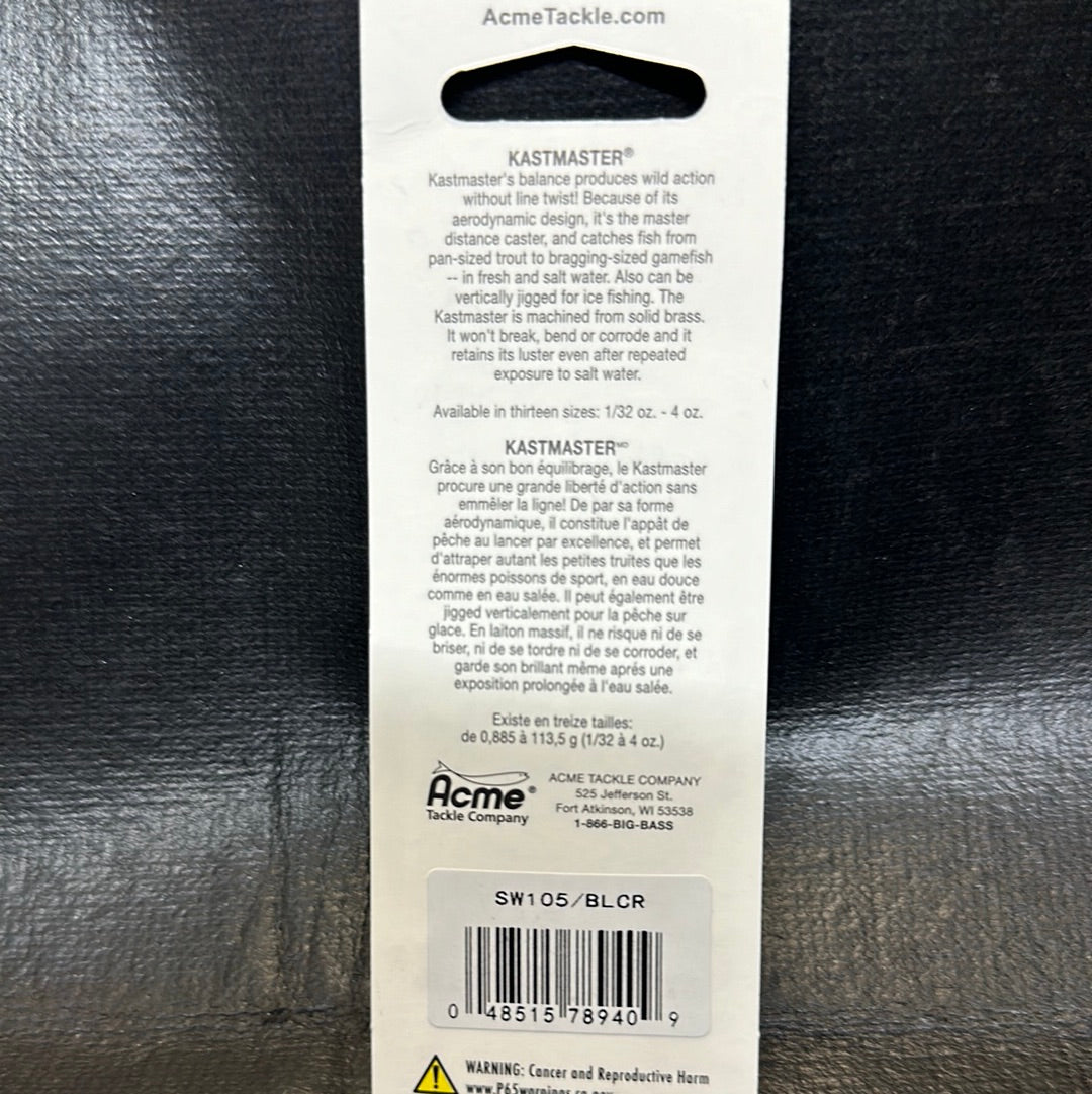 Kastmaster’s balance produces wild action without line twist! Because of its aerodynamic design, it’s the master distance caster, and catches fish from pan-sized trout to bragging-sized stripers – in fresh and salt water. The Kastmaster is precision machined. It will not break, bend or corrode and it retains its luster even after repeated exposure to salt water. Each lure comes with a split ring and a treble hook on the bottom of the lure.
