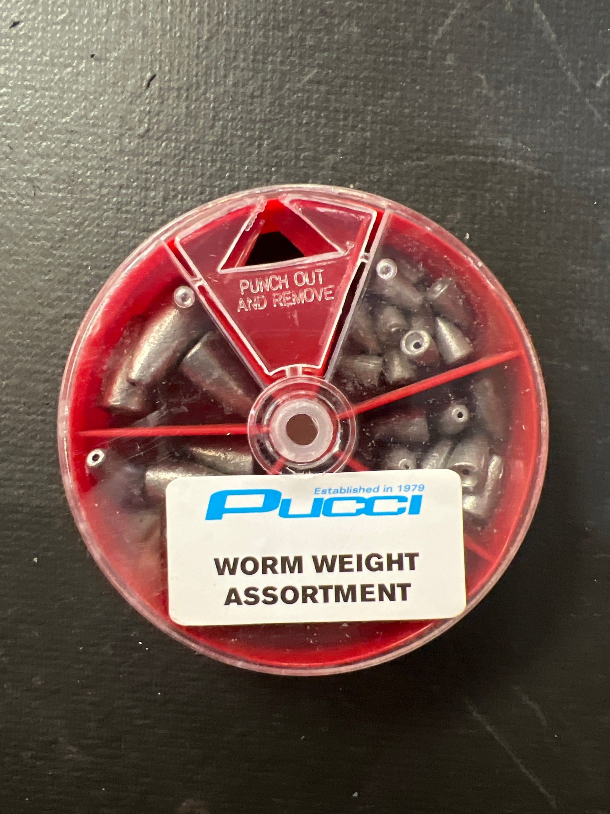 Assortment of tapered worm sinkers. 11 each of size 0, 7 each of size 1, 5 each of size 2, 4 each of size 3, 3 each of size 4.